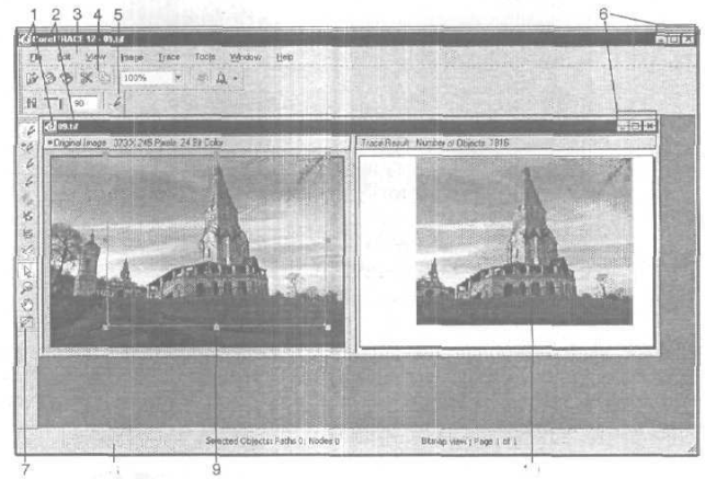 Рис. 15.1. Окно программы CorelTRACE: 1 — системные меню;2 — заголовки программы и документов; 3 — строка меню; 4 — стандартная панель; 5 — панель свойств; 6 — системные кнопки; 7 — блок инструментов;8 — строка состояния; 9 — растровое изображение; 10 — векторное изображение CorelTRACE входит в состав графического пакета CorelDRAW Graphic Suite в качестве дополнительной программы. Она предназначена для автоматической трассировки растровых изображений, то есть для создания их векторных копий. По качеству формируемых векторных изображений данная программа ничем не уступает известной программе трассировки Adobe Streamline 4.0, однако превосходит ее по широте- выполняемых функций и в удобстве эксплуатации. В частности, CorelTRACE предоставляет пользователю восемь режимов трассировки, четыре из которых используются для создания различных художественных эффектов (штриховки и мозаики). На рис. 15.1 представлено окно программы CorelTRACE в процессе трассировки. Слева находится исходное растровое изображение с областью, выделенной для трассировки, а справа — результирующее векторное. Вверху левой половины рабочего окна, содержащей растровое изображение, указываются размеры этого изображения (в пикселах) и его цветовой формат, а вверху правой половины — количество векторных объектов, составляющих трассированное изображение, По этому интегральному параметру вы сможете оценить сложность последующей обработки результирующего векторного изо- бражения и его файловый размер, а также проследить зависимость между параметрами трассировки, задаваемыми на панели свойств, и ее качеством.