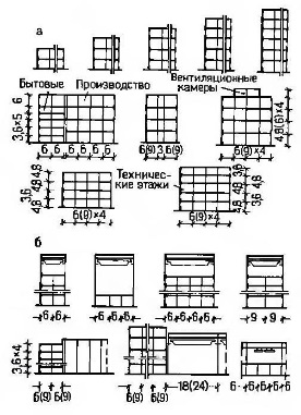 Наиболее распространено объемно-планировочное решение здания с регулярной структурой при прямоугольной форме плана, построенного на основе элементов ячейкового типа. Оно применяется при проектировании многоэтажных промышленных зданий химической, пищевой, электротехнической, легкой и других отраслей промышленности. Проектирование зданий с замкнутыми дворами допускается только тогда, когда это оправдано технологическим процессом. Однако для обеспечения надлежащего проветривания дворов их ширина должна быть не меньше высоты самого высокого из окружающих его зданий, но и не менее 18 м. Кроме того, на уровне первого этажа должны быть устроены сквозные проезды шириной не менее 4 м и высотой 4,5 м. Такие проезды необходимы как для проветривания, так и для сообщения внутреннего двора с территорией предприятия. В целях снижения трудоемкости и стоимости строительства при проектировании многоэтажных промышленных предприятий следует избегать сложных композиций зданий в плане, отдавая предпочтение простой, прямоугольной форме. В многоэтажных промышленных зданиях связи между этажами и технологическим вертикальным транспортом осуществляют при помощи лестниц, пассажирских и грузовых подъемников, а также при помощи специальных транспортных устройств в виде элеваторов и др. Многоэтажные промышленные здания регулярного типа имеют ячейковую или пролетную структуру при сетке колонн каркаса 6x6 м или 9X6 м. Высоту этажей в одном здании назначают одинаковой, за исключением первого этажа, где она может быть большей. Административные и бытовые помещения располагают в пределах производственных этажей, на антресолях, в подвале или в самостоятельных корпусах, пристраиваемых к промышленному зданию. Так как вспомогательные помещения имеют высоту меньшую, чем производственные помещения, то при проектировании надо выбирать решение, при котором бы достигалось рациональное использование пространства. В некоторых отраслях промышленности (например, в машиностроении, электронике и др.) применяют трех-пролетные здания с уменьшенным средним пролетом (крайние имеют размеры 6, 9 или 12 м, а средний 3 или 6 м). В этом случае образуется коридорная система планировки. Коридор используют для транспорта, прохода работающих и размещения технологических коммуникаций.