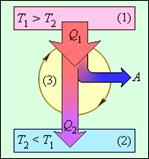 Коэффициент полезного действия указывает, какая часть тепловой энергии, полученной рабочим телом от «горячего» теплового резервуара, превратилась в полезную работу. Остальная часть (1 – η) была «бесполезно» передана холодильнику. Коэффициент полезного действия тепловой машины всегда меньше единицы (η < 1). Энергетическая схема тепловой машины изображена на рис. 3.11.2.