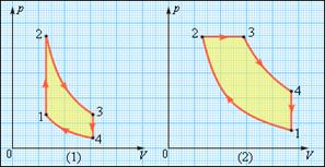 Рис. 3.11.3 Циклы карбюраторного двигателя внутреннего сгорания (1) и дизельного двигателя (2) В 1824 году французский инженер С. Карно рассмотрел круговой процесс, состоящий из двух изотерм и двух адиабат, который сыграл важную роль в развитии учения о тепловых процессах. Он называется циклом Карно (рис. 3.11.4).