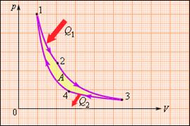 Рис.3.11.2 Энергетическая схема тепловой машины: 1 –нагреватель, 2 – холодильник, 3 – рабочее тело, совершающее круговой процесс. В двигателях, применяемых в технике, используются различные круговые процессы. На рис. 3.11.3 изображены циклы, используемые в бензиновом карбюраторном и в дизельном двигателях. В обоих случаях рабочим телом является смесь паров бензина или дизельного топлива с воздухом. Цикл карбюраторного двигателя внутреннего сгорания состоит из двух изохор (1–2, 3–4) и двух адиабат (2–3, 4–1). Дизельный двигатель внутреннего сгорания работает по циклу, состоящему из двух адиабат (1–2, 3–4), одной изобары (2–3) и одной изохоры (4–1). Реальный коэффициент полезного действия у карбюраторного двигателя порядка 30 %, у дизельного двигателя – порядка 40 %.