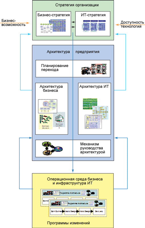 На рисунке 2.13 изображена инфраструктура, разработанная в ходе исследования Технологической Академии IBMв области EA; она использует все концепции объединения бизнес-стратегии предприятия с его программой изменений, т.е. демонстрирует позиционирование EA как связующего звена между стратегией предприятия (в области бизнеса и информационных технологий), рабочей средой бизнеса и инфраструктурой ИТ.