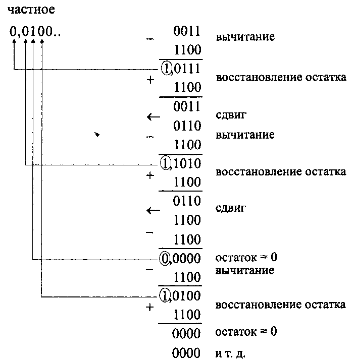 иначе C ≥1, что соответствует переполнению разрядной сетки. Процесс деления двоичных чисел может быть сведен к последовательности вычитаний и анализа знаков получающихся остатков. Сформулируем словесный алгоритм деления следующим образом: 1. Вычетают из делимого делитель. Если знак разности 0, то деление невозможно в силу нарушения условия (3.29), и следует, установив OV= 1, завершить операцию; иначе в разряд целой части частного записывают 0 (в конце операции в этот разряд помещается знак частного). 2. Так как остаток (разность A - В) оказался отрицательным, восстанавливают остаток путем добавления делителя к остатку. 3. Сдвигают восстановленный остаток влево на один разряд. 4. Вычитают из сдвинутого остатка делитель; если полученная разность положительна, то очередной цифрой частного становится 1, и следует перейти к п. 3; иначе очередная цифра частного — 0 и переходят к п. 2. Пункты 2 — 4 повторяют столько раз, сколько цифр требуется получить в частном. (Страница70) Пример 3.24 Деление дробных положительных чисел +(3/16): +(12/16)=+(1/4)=+(4/16) приведено на рис. 3.29.