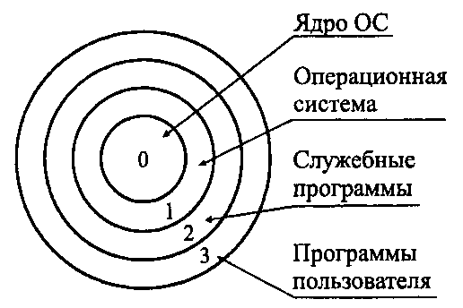 Защита памяти В x86 предусмотрены два вида защиты памяти: на уровне сегментов и на уровне страниц. (Страница186) В х86 определено понятие привилегии для сегмента и установлены 4 уровня привилегий PL (рис. 7.7), которые задаются номерами от 0 (наиболее защищенный) до 3 (низший). В ядро входит часть ОС, обеспечивающая инициализацию работы, управление доступом к памяти, защиту и ряд других жизненно важных функций, нарушение которых полностью выводит из строя МПС. Основная часть ОС должна иметь уровень 1. К уровню 2 обычно относят ряд служебных программ ОС, например, драйверы внешних устройств, системы управления базами данных, специализированные подсистемы программирования и др.