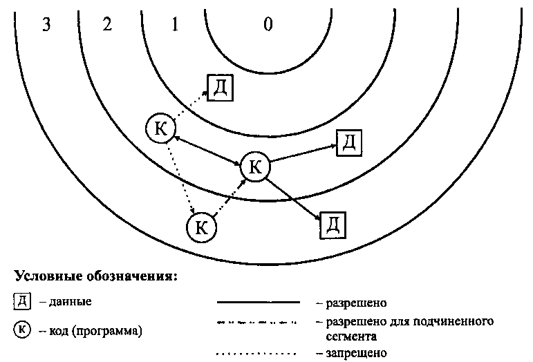 Рис. 7.8. Правила доступа к сегментам В системе команд существуют специальные привилегированные команды, которые могут выполняться процессором, работающим только на уровне привилегий 0. При попытке выполнить их на другом уровне привилегий генерируется прерывание 13 — нарушение общей защиты. К привилегированным относятся команды: □ останов процессора; □ сброс флага переключенной задачи; □загрузка регистров дескрипторных таблиц; □загрузка регистра задачи; □ загрузка слова состояния машины; □ модификация флага прерываний IF*; □ команды ввода/вывода*. Последние две группы команд (отмеченные *) не обязательно выполняются на нулевом уровне, достаточно, чтобы уровень привилегий программы был выше уровня привилегий ввода/вывода, определяемого полем IOPL в регистре EFLAGS.
