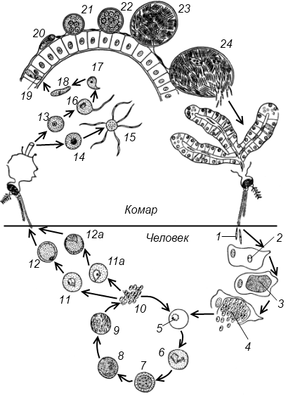 После нескольких циклов шизогонии в эритроцитах образуются гамонты, которые в организме комара превратятся в макрогаметы и микрогаметы. При сосании комаром крови больного человека, гамонты попадают в кишечник комара, где превращаются в гаметы. Из микрогамонта образуется 4–8 микрогамет, из макрогамонта – яйцеклетка, происходит копуляция гамет. Образовавшаяся в результате оплодотворения зигота обладает подвижностью и называется оокинетой. Оокинета мигрирует через стенку кишечника комара и на внешней поверхности кишечника превращается в ооцисту. Ядро ооцисты многократно делится и ооциста распадается на огромное количество спорозоитов – до 10000, этот процесс называется спорогонией. Спорозоиты перемещаются в слюнные железы комара. В жизненном цикле малярийного плазмодия человек является промежуточным хозяином (тканевая шизогония, эритроцитарная шизогония, начало гаметогонии), а малярийный комар – окончательным (завершение гаметогонии, оплодотворение и спорогония). У человека в организме паразитируют четыре вида плазмодиев. Временной интервал между выходами мерозоитов в плазму крови у одного из этих видов (P. malariae) – 72 часа, заболевание – четырехдневная малярия. У других видов (P. ovale, P. vivax, P. falciparum) – 48 часов Класс споровиков представляет собой обширную группу простейших организмов, ведущих исключительно паразитический образ жизни. Приспособление к паразитизму у них очень глубокое и совершенное. У всех споровиков отсутствуют специальные органоиды захвата пищи, и они питаются осмотическим путем. Хозяевами их являются самые различные беспозвоночные и позвоночные животные. Несколько видов споровиков паразитирует в человеке.