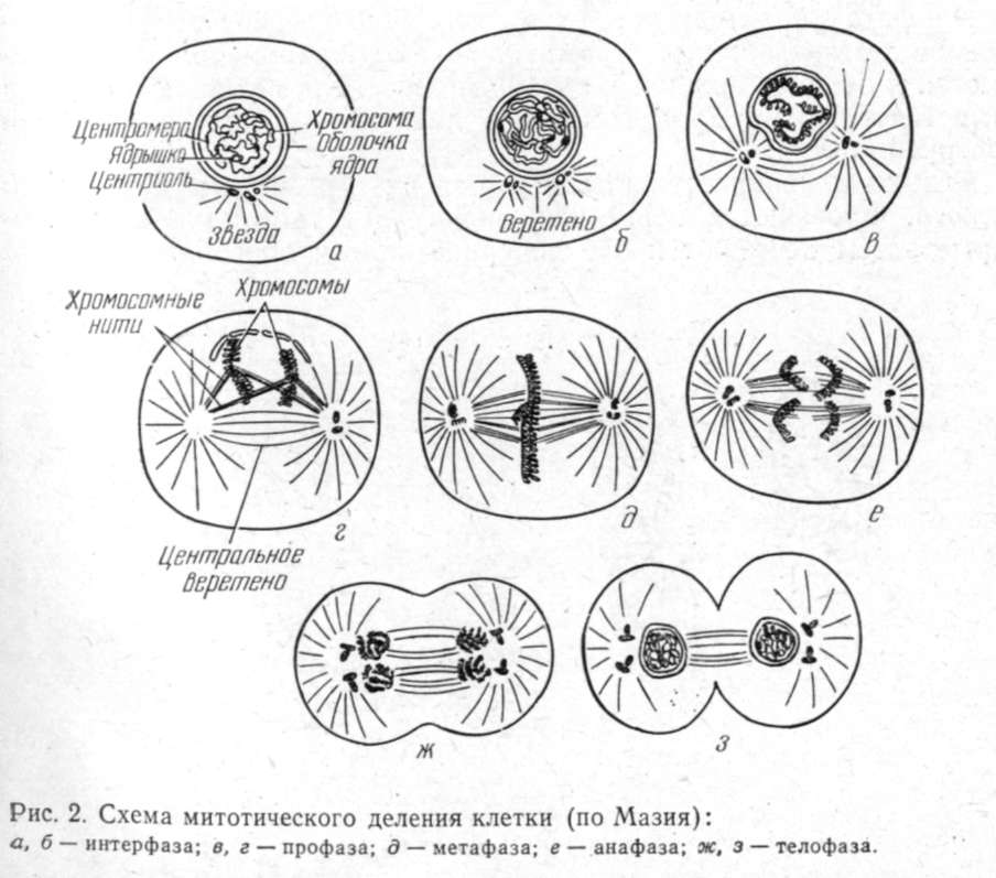 Мито́з (греч. μιτος — нить) — непрямое деление клетки, наиболее распространенный способ репродукции эукариотических клеток. Биологическое значение митоза состоит в строго одинаковом распределении хромосом между дочерними ядрами, что обеспечивает образование генетически идентичных дочерних клеток и сохраняет преемственность в ряду клеточных поколений. В результате митоза каждая из двух дочерних молекул обязательно включает одну старую спираль и одну новую. Новая молекула абсолютно идентична старой. В этом заключается глубокий биологический смысл: таким путем в бесчисленных клеточных поколениях сохраняется преемственность генетической информации. Профаза — спирализация хромосом, начало формирования веретена деления; в мейозе, кроме того, происходит конъюгация гомологичных хромосом с образованием бивалентов; метафаза — в митозе в экваториальной плоскости веретена деления располагаются отдельные хромосомы числом 2n, в мейоэе в плоскости экватора выстраивается п бивалеитов; анафаза —в митозе в результате расщепления центромер дочерние хромосомы (бывшие сестринские хроматиды) расходятся к разным полюсам (по 2n к каждому полюсу), в мейозе разрушаются бивалеиты и гомологи расходятся к разным полюсам (по одному из каждой лары); формируется гаплоидный набор хромосом; телофаза —в митозе формируются ядра дочерних клеток, в мейозе телофаза сокращена во времени, так как не происходит полной деспирализации хромосом и клетки сразу переходят ко второму делению. Результаты митоза — сохранение в дочерних клетках диплоидного набора хромосом (2n2с); результаты первого мейотического деления—образование клеток с гаплоидным набором двунитчатых хромосом.