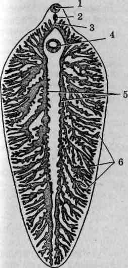 Материал. Печеночная двуустка довольно часто обнаруживается в протоках печени крупного рогатого скота. Зараженная печень легко распознается, так как желчные протоки в ней вздуваются, приподнимая местами ее поверхность. Кроме того, паразиты вызывают сильное обызвествление стенок протоков, что определяется на ощупь. Морфология печеночной двуустки. Тело сосальщика листовидное, расширенное в передней части и постепенно сужающееся кзади. Длина тела достигает 3-3,5 см при ширине около 1,5 см. На переднем конце, на небольшом конусовидном выросте располагается передняя, или ротовая, присоска, в центре которой находится ротовое отверстие, а на брюшной стороне тела в конце передней его трети — задняя, или брюшная, присоска. Ротовая присоска имеет чашевидную форму, ограничена кольцевой мышцей и хорошо различима под микроскопом. Брюшная присоска имеет поверхностное положение и с внутренними органами не связана (рис. 43). Ротовая и брюшная присоски выполняют роль органов фиксации, обеспечивая удержание сосальщика в протоках печени. Пищеварительная и половая системы печеночного сосальщика. Пищеварительная система с успехом может быть изучена на тотальных, окрашенных кармином препаратах. Ротовое отверстие ведет в мускулистую глотку, от которой отходят две ветви кишечника, продолжающиеся до заднего конца тела и многократно ветвящиеся. Боковые ответвления двух основных пищеварительных каналов достигают боковых стенок тела, что облегчает распределение продуктов пищеварения между органами и тканями через межклеточные участки паренхимы. Как у всех плоских червей, средняя кишка слепо замкнута, непереваренные остатки пищи удаляются через рот.