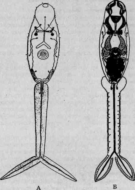 Рис. 46. Церкарии птичьих шистосоматид: А — Trichobilharzia ocellala; Б — Bilharziella polonica Класс Monogenoidea — моногенеи, или моногенетические сосальщики Моногенеи — исключительно паразитические животные, преимущественно эктопаразиты. Развитие происходит без смены хозяев, Тип Plathelminthes «ласе Monogenoidea