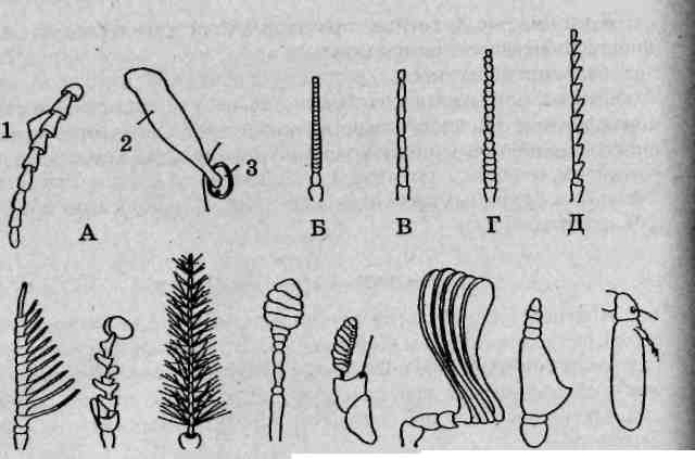 Антенны (усики) считаются придатками акрона (головной лопасти) и не гомологичны конечностям. Отсутствуют они только у бес-сяжковых (отряд Proturd). Основная функция антенн — чувствительная — обеспечивается наличием огромного числа рецепторов (химических, тактильных и др.). В составе многочлениковых антенн принято выделять: — основной членик (рукоятку), — ножку (педицелл), обычно имеющую наибольшую длину среди всех члеников, — жгутик (бич), объединяющий все остальные членики (рис. 112). групп весьма разнообразно. Для ознакомления с выделяемыми типами и особенностями строения антенн используются постоянные препараты, которые лучше просматривать под бинокуляром. Нитевидные антенны состоят из многочисленных линейно расположенных члеников и имеют одинаковую толщину по всей своей длине. Щетинковидные (шиловидные) антенны состоят из многочисленных линейно расположенных члеников и постепенно утончаются к вершине. Веретеновидные антенны имеют наибольшую ширину в средней части и постепенно сужаются как к вершине, так и к основанию. Четковидные антенны состоят из округлых или продолговато-овальных члеников, имеющих наименьший диаметр в местах при-членения к соседним. Пиловидные (пильчатые) усики состоят из члеников, имеющих боковые выступы наподобие зубцов пилы. 220 Тип Arthropoda Класс Insecta