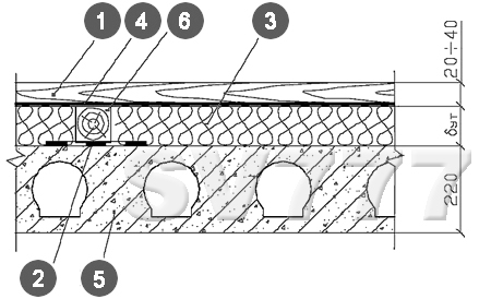 1- пол; 2- гидроизоляция; 3- теплоизоляционные плиты; 4- пароизоляция; 5- плита перекрытия; 6- лаги