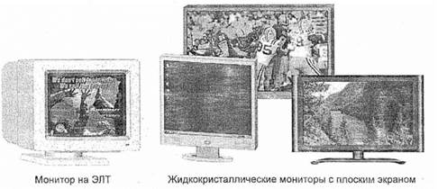 Для отображения видеовывода с персональных компьютеров обычно применяются две технологии: цветные видеомониторы на основе электронно-лучевой трубки (ЭЛТ) и жидкокристаллические мониторы с плоским экраном. Раньше доминирующим типом мониторов были мониторы па электронно-лучевой трубке, подобные монитору, показанному на рис. 1.28. Цветные мониторы на ЭЛТ иногда называются RGB-моииторами (Red, Green, Blue— красный, зеленый, синий), т. к. все цвета в таких мониторах получаются из трех основных цветов — красного, зеленого и синего. Но в настоящее время мониторы на ЭЛТ практически вытеснены жидкокристаллическими мониторами. Эти мониторы не такие громоздкие, как мониторы на ЭЛТ, поэтому они занимают меньше места, чем мониторы на ЭЛТ с таким же размером экрана. Жидкокристаллические мониторы также весят меньше и потребляют меньше электроэнергии, чем мониторы на ЭЛТ. На рис. 1.26 показаны разные типы мониторов, обычно используемые с системами ПК.
