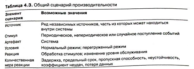 ♦ Условия. Система может находиться в разных рабочих режимах — в частности, нормальном, аварийном или перегруженном. В нашем примере система находится в нормальном режиме. ♦ Реакция. Система должна обрабатывать поступающие события. В результате этих действий условия могут поменяться (например, система может перейти из нормального в перегруженный режим). В нашем примере выполняется обработка транзакций. ♦ Количественная мера реакции. Среди возможных единиц измерения — продолжительность обработки поступающих событий (задержка или предельный срок обработки события), разброс вариантов продолжительности (неустойчивость), количество событий, которые система способна обработать за определенный период времени (пропускная способность), а также характеристика событий, обработка которых невозможна (коэффициент неудач, потеря данных). В нашем примере предполагается обработка транзакций со средней задержкой в две секунды. Элементы общих сценариев производительности представлены в табл. 4.3. На протяжении большей части истории программной инженерии производительность оставалась ведущим фактором создания архитектуры. В таком качестве она зачастую препятствовала реализации остальных атрибутов качества. По мере стремительного падения соотношения цены и производительности аппаратного оборудования и параллельного повышения издержек на разработку программного обеспечения серьезную конкуренцию производительности стали составлять другие атрибуты качества.