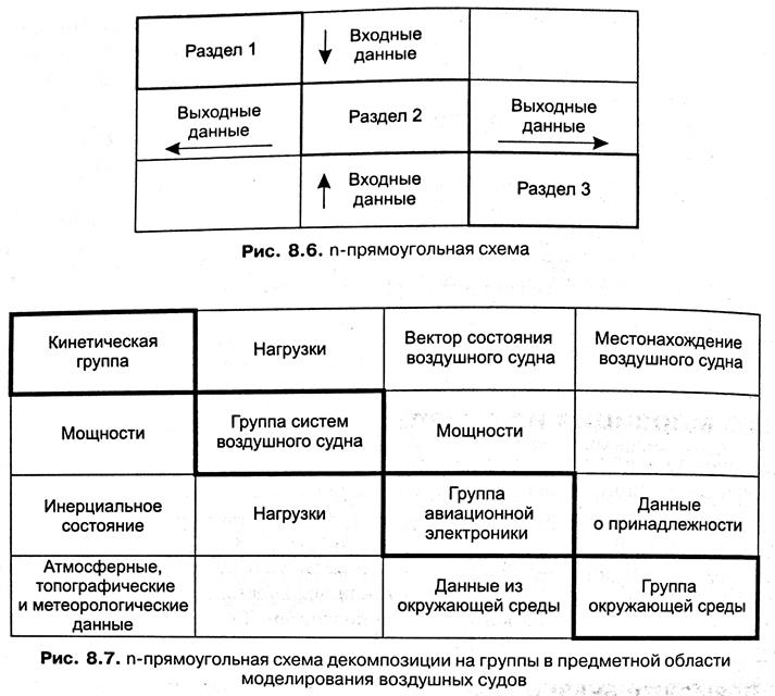 Декомпозиция на группы Декомпозиция на группы — это наиболее обобщенный вариант декомпозиции модели воздушного судна. Группы в свою очередь подлежат декомпозиции на системы, те — на подсистемы. Подсистемы содержат экземпляры контроллеров подсистем. Группы и системы не находят в архитектуре непосредственного отражения (никаких контроллеров групп в ней не представлено). Назначение их состоит в том, чтобы структурировать функциональность, распределяемую между различными экземплярами контроллеров подсистем. Такая декомиозиция проводится с участием n-прямоуголъных схем (n-square charts). n-прямоугольные схемы — это один из методов представления информации об интерфейсах системы. В нашем случае он помогает выразить связь между выбранными разделами. Ряд факторов, которые мы учитываем при принятии решений о разделении, связаны с интерфейсами разделов, а оценивать эти решения удобнее всего с помощью таких схем. Они, во-первых, помогают фиксировать входные и выходные данные модулей, а во-вторых, хорошо иллюстрируют применяемые в разных элементах проекта абстракции. Пример n-прямоугольной схемы приводится на рис. 8.6. Прямоугольники, Расположенные по главной диагонали, отражают разделы системы. Их входные Данные приводятся в столбце раздела, а выходные — в соответствующей ему строку Полный набор входных данных, таким образом, представлен объединенным содержимым всех ячеек столбца раздела. Полный набор данных выходных, соответственно, выражается объединением содержимого ячеек строки раздела. Поток Данных из одного раздела в другой проходит в последовательности «вправо, вниз, влево и вверх». n-прямоугольная схема, показанная на рис. 8.7, выражает интерфейсы между Вышеперечисленными группами. Для краткости мы опустили все внешние по ношению к модели воздушного судна интерфейсы. Представление также упрощено - элементы данных на схеме выражают совокупные коллекции данных.