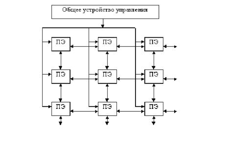 Рис. 13. Структура матричной вычислительной системы "SOLOMON" Система SОLOМОN содержит 1024 процессорных элемента, соединены в виде матрицы: 32х32. Каждый процессорный элемент матрицы включает в себя процессор, обеспечивающий выполнение последовательных поразрядных арифметических и логических операций, а также оперативное ЗУ, емкостью 16 Кбайт. Длина слова - переменная от 1 до 128 разрядов. Разрядность слов устанавливается программно. По каналам связи от устройства управления передаются команды и общие константы. В процессорном элементе используется, так называемая, много модальная логика, которая позволяет каждому процессорному элементу выполнять или не выполнять общую операцию в зависимости от значений обрабатываемых данных. В каждый момент все активные процессорные элементы выполняют одну и ту же операцию над данными, хранящимися в собственной памяти и имеющими один и тот же адрес. Идея многомодальности заключается в том, что в каждом процессорном элементе имеется специальный регистр на 4 состояния - регистр моды. Мода (модальность) заносится в этот регистр от устройства управления. При выполнении последовательности команд модальность передается в коде операции и сравнивается с содержимом регистра моды. Если есть совпадения, то операция выполняется. В других случаях процессорный элемент не выполняет операцию, но может, в зависимости от кода, пересылать свои операнды соседнему процессорному элементу. Такой механизм позволяет выделить строку или столбец процессорных элементов, что очень полезно при операциях над матрицами. Взаимодействуют процессорные элементы с периферийным оборудованием через внешний процессор. Дальнейшим развитием матричных процессоров стала система ILLIАC-4, разработанная фирмой BARRОYS. Первоначально система должна была включать в себя 256 процессорных элементов, разбитых на группы, каждый из которых должен управляться специальным процессором. Однако по различным причинам была создана система, содержащая одну группу процессорных элементов и управляющий процессор. Если в начале предполагалось достичь быстродействия = 1 млрд. операций в секунду, то реальная система работала с быстродействием = 200 млн. операций в секунду. Эта система в течение ряда лет считалась одной из самых высокопроизводительных в мире. В начале 80-х годов в СССР была создана система: ПС-2000, которая также является матричной. Основой этой системы является мультипроцессор - ПС-2000, состоящий из решающего поля и устройства управления мультипроцессором. Решающее поле строится из одного, двух, четырех или восьми устройств обработки, в каждом из которых - 8 процессорных элементов. Мультипроцессор из 64 процессорных элементов обеспечивает быстродействие = 200 млн. операций в секунду на коротких операциях.
