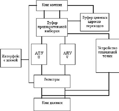Рис 16. Упрощенная блок схема процессора Pentium Основные характеристики: ü двухпотоковая суперскалярная организация, допускающая параллельное выполнение пары простых команд; ü наличие двух независимых двухканальных множественно-ассоциативных кэшей для команд и для данных, обеспечивающих выборку данных для двух операций в каждом такте; ü динамическое прогнозирование переходов; ü конвейерная организация устройства плавающей точки с 8 ступенями; ü двоичная совместимость с существующими процессорами семейства 80x86. Прежде всего новая микроархитектура этого процессора базируется на идее суперскалярной обработки (правда с некоторыми ограничениями). Основные команды распределяются по двум независимым исполнительным устройствам (конвейерам U и V). Конвейер U может выполнять любые команды семейства x86, включая целочисленные команды и команды с плавающей точкой. Конвейер V предназначен для выполнения простых целочисленных команд и некоторых команд с плавающей точкой. Команды могут направляться в каждое из этих устройств одновременно, причем при выдаче устройством управления в одном такте пары команд более сложная команда поступает в конвейер U, а менее сложная - в конвейер V. Такая попарная выдача команд возможна правда только для ограниченного подмножества целочисленных команд. Команды арифметики с плавающей точкой не могут запускаться в паре с целочисленными командами. Одновременная выдача двух команд возможна только при отсутствии зависимостей по регистрам. При остановке команды по любой причине в одном конвейере, как правило останавливается и второй конвейер. Остальные устройства процессора предназначены для снабжения конвейеров необходимыми командами и данными. Используется раздельная кэш-память команд и данных емкостью по 8 Кбайт, что обеспечивает независимость обращений. В процессоре предусмотрен механизм динамического прогнозирования направления переходов. Это позволяет избежать простоев конвейеров при правильном прогнозе направления перехода. Окончательное решение о направлении перехода естественно принимается на основании анализа кода условия. При неправильно сделанном прогнозе содержимое конвейеров аннулируется и выдача команд начинается с необходимого адреса. Неправильный прогноз приводит к приостановке работы конвейеров на 3-4 такта.