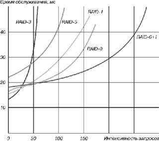 Рис. 26. Типичная зависимость времени обслуживания запросов от интенсивности запросов Формы кривых для RAID различного уровня хорошо объясняют поведение системы с RAID в реальных условиях. RAID-0+1 обеспечивает минимальное время обслуживания при гораздо более интенсивном потоке запросов, чем все остальные уровни RAID. Более того, увеличение времени обслуживания при увеличении интенсивности потока запросов происходит достаточно плавно, благодаря чему уменьшение производительности почти незаметно для большинства пользователей. Несколько худшими характеристиками обладает система, использующая RAID-1. При увеличении интенсивности запросов увеличение времени обслуживания практически пропорционально числу запросов (примерно эквивалентно количеству подключенных к системе пользователей). Плавное снижение производительности очень хорошо воспринимается пользователями. В большинстве случаев именно RAID уровня 1 или уровня 0+1 обеспечивают наилучшую производительность в реальных системах. RAID уровня 3 обеспечивает очень высокую производительность при редких запросах, но при увеличении интенсивности запросов увеличение времени обслуживания происходит очень быстро. Это не позволяет рекомендовать RAID уровня 3 в серверах, и особенно в серверах, предназначенных для обслуживания баз данных. RAID уровня 5 занимает промежуточное положение. Несколько по-другому ведут себя RAID-ы при обслуживании больших запросов (интенсивный обмен длинными файлами). Для таких приложений RAID-3 показывает ощутимо лучшую производительность, чем RAID-5. Возможности RAID-0 несколько скромнее, однако лучше, чем у RAID-3 и RAID-5. Эти условия оказываются очень трудными для RAID-1. По времени обслуживания длинных запросов RAID-1 значительно уступает всем другим вариантам RAID. По-прежнему лидирующим оказывается RAID-0+1.