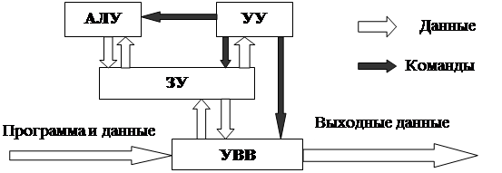 Рис. 2.1. Структурная схема вычислительной машины, Управление машиной осуществляет устройство управления УУ. Программа и данные через устройство ввода-вывода УВВ поступают в запоминающее устройство ЗУ. Устройство управления своими командами побуждает рифметико-логическое устройство АЛУ читать из запоминающего устройства команды программы и данные и выполнять команды программы. По мере выполнения команд получающиеся новые данные поступают в запоминающее устройство. Команды вывода информации поступают в запоминающее устройство и в устройство ввода-вывода, которые выполняют пересылку данных на выход вычислительной машины. Комбинацию АЛУ и УУ современная терминология определяет как центральный процессор. В настоящее время в центральный процессор вводятся специальные устройства памяти на восемь и более битов, которые называются регистрами и предназначены для хранения данных, участвующих в вычислениях, промежуточных результатов и служебной информации. По мере развития вычислительных машин появились идеи увеличения производительности и объёмов хранимых данных и программ. Это привело к расширению структурной схемы вычислительной машины. Расширенная структурная схема вычислительной машины показана на рис. 2.2.