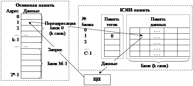 2.4.4. КЭШ-память Применение КЭШ-памяти является экономичным решением повышения производительности запоминающего устройства без замены всей основной динамической памяти на статическую. Полная замена вызывает существенное повышение цены. КЭШ-память состоит из двух частей: памяти тегов и памяти данных. Основная память разбивается на блоки по k слов (длина слова кратна целому числу байт). Основная память состоит из М блоков, а КЭШ-память – из С блоков, причём С<М. В КЭШ-памяти находятся копии подмножества блоков основной памяти. Схема взаимодействия КЭШ-памяти и основной памяти показана на рис. 2.5.