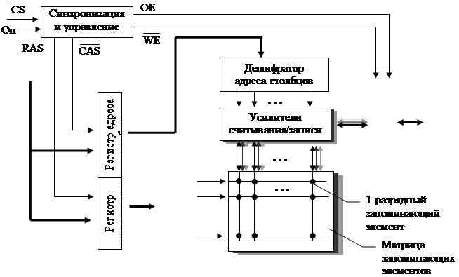 · · · Стробы строки и столбца разрешают работу регистров адресов строки и столбца, которые преобразуют адрес A0…Dm-1 в пару чисел, являющихся адресами строки и столбца. Дешифраторы адреса строк и столбцов преобразуют многоразрядные параллельные двоичные коды в многоразрядные параллельные единичные коды, импульсы которых выбирают строки и столбцы матриц запоминающих элементов. Усилители считывания/записи передают адрес столбца на матрицы запоминающих элементов, а также соединяют двунаправленный регистр данных с выбранными запоминающими элементами ОЗЭ.