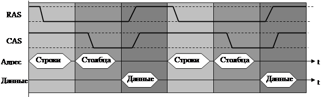 Временная диаграмма классической процедуры работы с памятью показана на рис. 3.7. Цикл работы с памятью состоит из трёх тактов. В начале первого такта выставляется адрес строки, в начале второго – адрес столбца и в начале третьего – данные на шине данных компьютера при записи и на выходах усилителей считывания/записи микросхемы при чтении данных. Активными уровнями сигналов RAS и CAS являются низкие уровни. По заднему фронту первого из них читается в регистр адреса строк адрес строки, по заднему фронту второго – адрес столбца попадает в регистр адреса столбца. Установка высоких потенциалов этих сигналов является сигналом считывания или записи данных.
