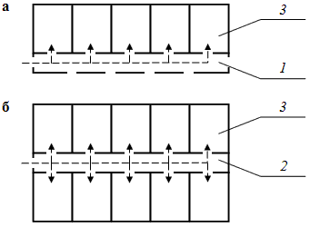 Система с горизонтальными коммуникационными помещениями предусматривает связь между основными помещениями здания через коммуникационные помещения (коридоры, открытые галереи). Это позволяет основные помещения проектировать непроходными. При этом помещения могут быть расположены по одну (рис. 2.2 а) или по обе стороны коридора (рис. 2.2 б). При одностороннем расположении помещений коридор имеет хорошую освещенность естественным светом, которая в некоторых случаях необходима, например, в школах, где коридор одновременно служит в качестве рекреационного помещения.