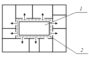 Рис. 2.4. Атриумная система планировки 1 – атриум; 2 – коммуникационные помещения Помимо традиционного использования в южном жилище она широко применяется в проектировании малоэтажных зданий с крупными залами (крытых рынках, музеях, выставочных комплексов, школ), а также многоэтажных гостиниц и административных помещений.Преимущества этой системы при открытых дворах – тесная связь между необходимыми по технологической схеме открытыми и закрытыми пространствами (в здании рынка – связь между торговыми залами и пространством сезонной торговли, в здании музея – между закрытой и открытой экспозицией).Преимущества атриумной системы при закрытых дворах – создание круглогодично функционирующих общественных пространств и повышение теплоэкономичности здания в целом. Секционная система заключается в компоновке здания из одного или нескольких однохарактерных фрагментов (секций) с повторяющимися поэтажными планами, причем помещения всех этажей каждой секции связаны общими вертикальными коммуникациями – лестницей или лестницей и лифтами. Секционная система – основная в проектировании многоквартирных жилых домов средней и повышенной этажности, отдельные фрагменты этой системы включаются в объемно-планировочную структуру зданий общежитий, больниц, некоторых административных помещений и др.