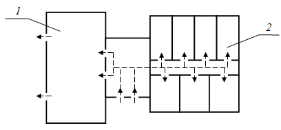 Рис. 2.6. Смешанная система планировки 1 – зальная система; 2 – коридорная система Как правило, требованиям удобства отвечает наиболее компактное размещение помещений с кратчайшими путями движения людей и средств транспорта, без взаимных их пересечений и встречного движения. Чем короче пути движения и, следовательно, меньше по площади коммуникационные помещения, тем меньше объем здания и ниже его стоимость. Помещения, связанные функциональным или технологическим процессом, должны располагаться возможно ближе друг к другу. Это условие особенно важно для производственных предприятий, где протяженность путей движения предметов производства влияет не только на объем здания, но и на стоимость продукции. Не менее важно для производственных и общественных зданий отсутствие пересечений людских потоков, а пересечение людских потоков с грузовыми вообще недопустимо как по технологическим условиям, так и по условиям безопасности. Разработка объемно-планировочного решения (ОПР) осуществляется на основе схемы функциональных процессов, происходящих в здании (функциональной или технологической схемы). Она представляет собой условное графическое изображение группировки помещений и функциональных связей между ними. При значительной сложности составления (например, при проектировании промышленных зданий со сложным технологическим процессом – сборочных конвейеров автозаводов и т.п.) функциональная или технологическая схема разрабатывается специалистом-технологом совместно с архитектором. Многие здания независимо от назначения имеют однотипные отдельные помещения и их группы – архитектурно-планировочные элементы (главный вход в здание, лестница, транспортные узлы, санитарно-технические узлы). Их планировочное решение и размещение в здании оказывает существенное влияние на компоновку плана здания в целом. Каждое здание, как правило, имеет главный вход и обычно несколько второстепенных (служебных) входов. Через главный вход проходят основные массы людей, участвующих в функциональном процессе; второстепенные входы обычно обслуживают подсобные функциональные процессы, а также являются запасными эвакуационными выходами. Главный вход в здание должен быть хорошо виден при приближении к нему. Входная площадка обычно защищается навесом от атмосферных осадков. Для защиты от проникания холодного воздуха у наружных дверей устраиваются небольшие помещения – тамбуры. Для климатической зоны, в которой находится Нижегородская область, достаточно применение обычного одинарного тамбура. Для северных регионов (при более низкой температуре наиболее холодной зимней пятидневки) обязательно применение двойного тамбура. Далее располагается вестибюль и гардероб. Вестибюль – это коммуникационное помещение с распределительными функциями, откуда потоки людей направляются в коридоры, на лестницы, к подъемникам. Площадь гардероба и вестибюля зависит от количества пользующихся ими людей. При входном узле обычно располагаются некоторые помещения обслуживающего назначения (комнаты охраны, торговые киоски, санитарные узлы и т.п.). Расположение лестничных клеток и шахт лифтов в значительной степени влияет на планировку, поскольку они должны занимать одно и то же относительное положение в плане каждого этажа здания. На планировку эта