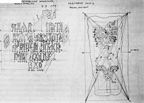 Детали, обладающие слабым рельефом, как, например, плиты с вырезанными на них надписями, лучше всего копировать непосредственно на бумагу, притирая ее к рельефу, или на кальку, обводя контуры рельефа углем, кистью или мягким карандашом (3—6 В). (Рис. 64)
