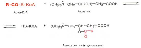 В результате реакции образуется ацил-КоА, являющийся активной формой жирной кислоты. Считают, что активация жирной кислоты протекает в 2 этапа. Сначала жирная кислота реагирует с АТФ с образованием ациладенилата, представляющим собой эфир жирной кислоты и АМФ. Далее сульфгидрильная группа КоА действует на прочно связанный с ферментомациладенилат с образованием ацил-КоА и АМФ. Транспорт жирных кислот внутрь митохондрий. Коэнзимная форма жирной кислоты, в равной мере как и свободные жирные кислоты, не обладает способностью проникать внутрь митохондрий, где, собственно, и протекает их окисление. Переносчиком активированных жирных кислот с длинной цепью через внутреннюю митохондриальную мембрану служит карнитин. Ацильная группа переносится с атома серы КоА на гидро-ксильную группу карнитина с образованием ацилкарнитина, который диффундирует через внутреннюю митохондриальную мембрану: