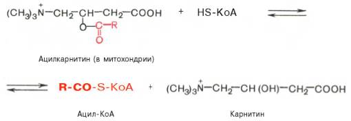 Реакция протекает при участии специфического цитоплазматического фермента карнитин-ацилтрансферазы. Уже на той стороне мембраны, которая обращена к матриксу, ацильная группа переносится обратно на КоА, что термодинамически выгодно, поскольку О-ацильная связь в кар-нитине обладает высоким потенциалом переноса группы. Иными словами, после прохождения ацилкарнитина через мембрану митохондрий происходит обратная реакция – расщепление ацилкарнитина при участии HS-KoA и митохондриальной карнитин-ацилтрансферазы: