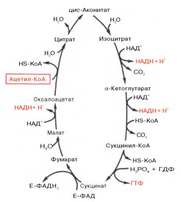 Образовавшийся ацетил-КоА подвергается окислению в цикле трикар-боновых кислот, а ацил-КоА, укоротившийся на два углеродных атома, снова многократно проходит весь путь β-окисления вплоть до образования бутирил-КоА (4-углеродное соединение), который в свою очередь окисляется до 2 молекул ацетил-КоА (рис.1). Например, при окислениипальмитиновой кислоты (С16) повторяется 7 циклов β-окисления. Запомним, что при окислении жирной кислоты, содержащей п углеродных