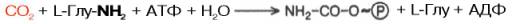 К настоящему времени открыты три разных пути синтеза карбамоил-фосфата de novo, катализируемые тремя разными ферментами. Первуюнеобратимую реакцию катализирует регуляторный фермент – аммиакзави-симая карбамоилфосфатсинтетаза (КФ 6.3.4.16):