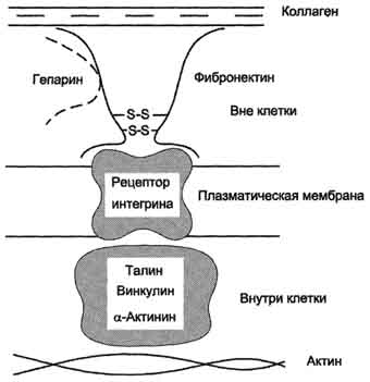 Рис.3 Строение фибронектина. коллаген, протеогликаны, гиалуроновую кислоту, углеводы плазматических мембран, гепарин, фермент трансглутаминазу. Благодаря своей структуре фибронектин может выполнять интегрирующую роль в организации межклеточного вещества, а также способствовать адгезии клеток. Существует несколько форм фибронектина, которые синтезируются разными клетками. Растворимый, или плазменный, фибронектин синтезируется гепатоцитами. Нерастворимый, или тканевый фибронектин синтезируется в основном фибробластами или эндотелиоцитами, глиоцитами и эпителиальными клетками. Обе формы фибронектина вовлекаются в разнообразные процессы: способствуют адгезии и распространению эпителиальных и мезенхимальных клеток, стимулируют пролиферацию и миграцию эмбриональных и опухолевых клеток, контролируют дифференцировку и поддержание цитоскелета клеток, активно участвуют в воспалительных и репаративных процессах. Это связано с тем, что каждая субъединица фибронектина содержит последовательность Арг-Гли-Асп (RGD), с помощью которой он может присоединяться к клеточным рецепторам (интегринам). Эти рецепторы опосредованно взаимодействуют с актиновыми микрофиламентами, которые находятся в цитозоле. В этом процессе участвуют так называемые белки прикрепления (от англ. attach - прикреплять proteins ): талин, винкулин, α-актинин (рис.4). С помощью таких белок-белковых взаимодействий информация может передаваться из межклеточного