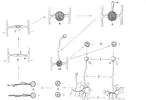 1 – два мицелия различных физиологических знаков (n); 2 – спорангиеносцы; 3 – спорангии; а – колонка; 4 – противоположные по физиологическому знаку споры; 5 – прорастание спор; 6 – сближение гаметангиев (n) = гаметангиогамия; п – подвесок; г – гаметангии; 7 – обособление гаметангиев; г –гаметангии; 8 – зигоспорангий (2n); 9,10 – прорастающая мицелием зигоспора (n); м – мицелий; 11 – споры.