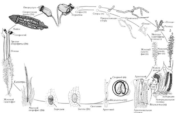 Лишайники — это симбиотические организмы. Тесное взаимовыгодное сосуществование двух разных видов называют симбиозом, то есть здесь симбиоз водоросли и гриба. Эти растения произрастают в любых условиях. На Земном шаре их насчитывается более 26 000 видов. Лишайники — широко распространенные в природе организмы. Они встречаются повсюду: в горных лесах, на морских берегах, на отвесных скалах. Живя на скалах, на камнях, неплодородных почвах, коре деревьев, в том числе и в различных субстратах и в других местах, они участвуют в почвообразовании. Их тело не членится ни на какие органы. В горах и степях на камнях растут чаше всего накипные лишайники. Если рассматривать тонкий срез под микроскопом, то видно, что тело накипного лишайника состоит из переплетенных бесцветных нитей. Это грибница (мицелий). Среди сплетений нитей заметны ярко-зеленые шарики — клетки. Это одноклеточные водоросли. Таким образом, в одном организме лишайника совместно сосуществуют два растения: гриб и водоросль. Во время дождя мицеллий гриба лишайника впитывает воду и удерживает ее. Кроме того, своими нитями грибница всасывает с поверхности камней растворенные в воде минеральные соли. Водоросли поглощают накопленную грибницей воду и из воздуха углекислый газ, и под действием света образуют из них органические вещества. Этими органическими веществами питаются все клетки лишайника. Размножаются лишайники в основном при помощи спор, а также вегетативным способом — кусочками своего тела. Помимо накипных лишайников в природе встречаются и другие их виды — листоватые и кустистые. Тело листоватых лишайников похоже на листья — плоское. Нижним концом лист прикреплен к телу. Тело кустистых лишайников разветвленное, приподнимается или свисает. На севере и в тундре растет олений лишайник. Этот сероватый лишайник, относящийся к кустистым лишайникам, является основным кормом для северных оленей. Из различных видов лишайников готовят разнообразные лекарственные и ароматические вещества для парфюмерной промышленности. Нет сомнения в том, что любые виды лишайников в природе и народном хозяйстве имеют огромное значение, так как участвуют в почвообразовании, что необходимо для высших растений. Продукты жизнедеятельности лишайников, например, кислоты, задерживая влагу на камнях, постепенно их разрыхляют и превращают в мелкие частицы для образования почвы. Лишайники — показатели чистоты атмосферного воздуха: если есть сильное загрязнение почвы и воздуха в городах из-за промышленных отходов, то на коре деревьев лишайники начинают исчезать. Таким образом, лишайники — организмы, сосуществующие вместе с грибами и водорослями, — широко распространены в природе. Они занимают особое место в процессе почвообразования. 30. Мхи. Общая характеристика. Жизненный цикл на примере зелёных мхов. Моховидные — вечнозеленые, автотрофные, в основном многолетние растения (рис. 1 и 2). Низкоорганизованные моховидные не имеют расчленения на стебель и лист, их тело представляет собой слоевище (таллом). Более организованные представляют собой листостебельные растения. Корней нет, всасывание воды и прикрепление к субстрату осуществляется выростами — ризоидами. В отличие от других растений в жизненным цикле моховидных (рис. 3) преобладает гаметофит (половое поколение), спорофит (бесполое