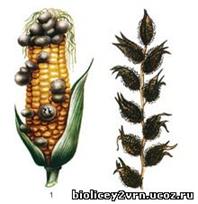 Поражает листья, стебли, цветки, семена, реже корни (соцветия и зерновки злаков) - на месте эндосперма зерновок образуется скопление чёрных спор (колосья выглядят обугленными)