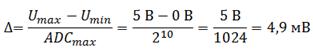 Разрядность АЦП характеризует количество дискретных значений, которые преобразователь может выдать на выходе. В двоичных АЦП разрядность измеряется в битах. Разрядностью АЦП определяется и его разрешение – минимальное изменение величины входного аналогового сигнала, которое может быть зафиксировано данным АЦП. АЦП преобразовывает сигнал (напряжение), находящийся в диапазоне измеряемых сигналов. Нижняя и верхняя граница этого диапазона определяются напряжениями, поданными на соответствующие выводы. Для микроконтроллера (МК) со встроенным АЦП нижняя граница – это уровень GND (0 В), а верхняя подается на отдельный вывод (AREF – Analog Reference) или используются внутренние источники опорных напряжений. При диапазоне входных напряжений от 0 В до 5 В и использовании 10-битного АЦП мы имеем следующее разрешение АЦП Δ (рис. 6.3).