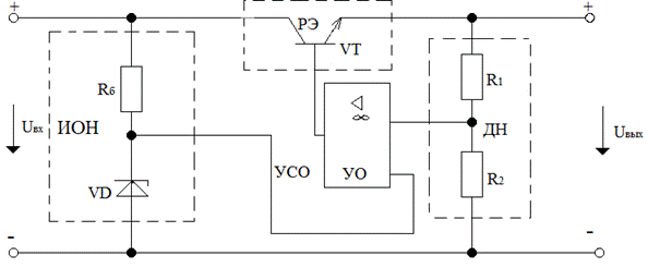 Источник опорного напряжения (ИОН) – это обычный параметрический стабилизатор схемы рис. 7.4 Усилитель сигнала ошибки УСО выполнен на операционном усилителе ОУ. Регулирующий (компенсирующий) элемент РЭ построен на транзисторе VT по схеме эмиттерного повторителя, т.е. транзистор VT всегда работает в активной области и на нем большие потери мощности. Коэффициент передачи по напряжению такого регулирующего элемента близок к единице. Уравнение компенсационного стабилизатора можно записать в следующем виде: