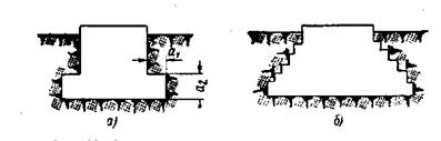 Четвертый этап. Производят проверку давления фундамента на грунт точно так же, как это указывалось для жестких плит – фундаментов первой группы. Если удельное давление окажется недопустимо большим, следует увеличить площадь основания фундамента, не меняя верхнего основания (рис. 12, а). Расширяющие уступы оказываются достаточно прочными, когда для их размеров выдержано соотношение: