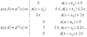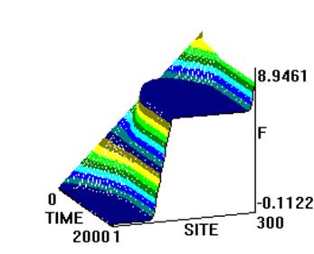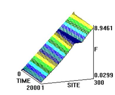 Как видим, системы (2) и (4) существенно различаются. Отметим, однако, что проведенное нами численное моделирование динамики систем (2) и (4) показало следующее: если в качестве начальных условий для численного интегрирования (2) выбрать односолитонное решение его “непрерывного аналога” (3) - кинк (см. выше), то обнаруживается принципиальное сходство в характере решений. Однако, при задании начальных условий в следующем виде: