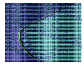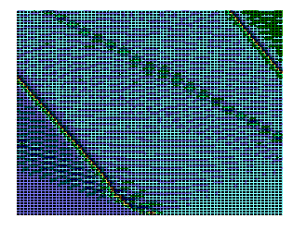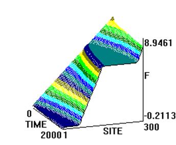 Численное интегрирование системы (2) (рис. 1) показало, что образуются две уединенных волны, движущихся справа налево по цепи с постоянной скоростью. Первая волна имеет форму квазикинка, а вторая волна имеет форму квазибризера, причем скорость первой волны превосходит таковую для второй. Обе волны за счет “квазициклических” граничных условий, доходя до левого конца, появляются на правом конце без изменения своей формы. Квазикинк, проходя по цепи маятников, изменяет координату каждого маятника на угол На рис. 2 представлены результаты интегрирования системы (4) при тех же условиях. Из рисунка видно, что образуются те же две уединенных волны - квазикинк и квазибризер. Но принципиальное отличие от рассмотренного случая состоит в том, что квазикинк в самом начале движется с отрицательным ускорением, так что в результате его скорость оказывается меньше скорости квазибризера. Заметим, что исследования проводились на однородной поли-A-последовательности; так что изменение скорости квазикинка нельзя объяснить влиянием неоднородности цепочки. Этот эффект объясняется нелинейным взаимодействием между ее мономерами. Рис. 3 иллюстрирует результаты интегрирования системы (4) при тех же условиях за исключением того, что A =2. В данном случае реализуется только квазикинк и его отрицательное ускорение в начале движения таково, что в результате он движется в направлении, противоположном первоначальному. При интегрировании системы (2) в аналогичных условиях также образуется только квазикинк. Его скорость не меняется по сравнению со случаем рис. 1. Существенно, что при соответствующих условиях в системе типа ДНК или РНК могут возникнуть перевзбужденные ровибронные состояния. На квантовом языке это было бы адекватно перезаселению высоко лежащих квантовых уровней по сравнению с основным (реализации инверсной заселенности). В этом случае возникает заманчивая мысль, связанная с принципиальной возможностью создания биосолитонного лазера (БСЛ) на молекулах ДНК[22]. Однако, в теории динамики биополимеров хорошо известно, что конформационные движения реализуются по механизму ограниченной диффузии ввиду сильного влияния диссипативных сил со стороны микроокружения. По этой причине решение проблемы создания БСЛ на ДНК представляется весьма проблематичным, по крайней мере, для подтверждения идеи необходимо выполнение условий: Существует также и другая сложность в отношении самосогласования биосолитонов и волны электромагнитного переизлучения. Напомним, что математическое моделирование в данном случае проводилось на монотонной поли-A ДНК и поэтому оставалось неясным влияет ли гетерогенная естественная последовательность ДНК на динамику солитонного возбуждения в молекуле. Чтобы проверить это, как и ранее, был взят С-район ДНК на 3’-конце вируса саркомы птиц в качестве полигона для запуска солитонов на разных участках полимера. На этот раз вычисляли производную от функции с тем, чтобы нагляднее показать движения солитонов. На рис.5,6 (см. ниже) хорошо видно, как при сдвиге области возбуждения солитонной волны от правой нижней части графика налево траектория волны претерпевает существенные изменения, т.е. “словесно-речевое” наполнение ДНК отображается в поведении солитона. Но главное здесь не только и не столько в этом. На этот раз характер