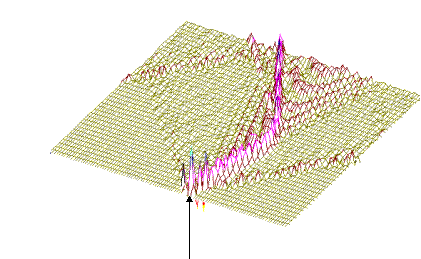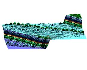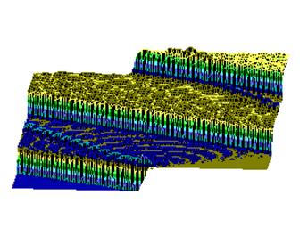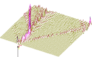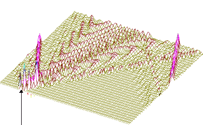 На рис.1 и рис. 2 кинки имеют форму пиков “горных гряд”, а не ступенек, поскольку взята производная от функции уравнения синусГордона. Здесь горизонтальная ось последовательность ДНК, верти-кальная амплитуда солитона. Ось на зрителя время. Видно, как при изменении места инициации солитона на определенных последо-вательностях полинуклеотида заметно меняется динамика этой уеди-ненной волны в форме ее колебательных движений вдоль цепочки ДНК. Исследуемый район молекулы богат функционально (и семантически) биологически значимыми участками, и мы вправе ожидать, что они, эти участки, будут изменять, модулировать, то есть вводить ДНК “текстовую” информацию в солитонную волну как в переносчик генетических сообщений. Такая модуляция колебательной структуры солитонов отчетливо наблюдается на приведенных графиках. Можно полагать, что спектральный состав частот колебаний солитонов является одним из механизмов преобразования текстовых структур ДНК и РНК в волновую форму и средством передачи генетических и иных сообщений в одномерном пространстве вдоль цепочек полинуклеотидов и (или) в трехмерном измерении генома как отдельной клетки, так и тканевого континуума биосистемы.