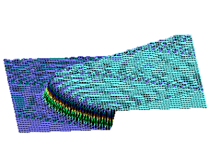 Рис.5 а) Результаты численного моделирования динамики распространения возмущений в ДНК на основе системы (2) при значении параметра A=1. б) То же, вид сверху.