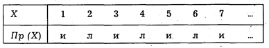 Рис. 12. Матрица предиката Пр (Х) = "X есть простое число" Сверху в таблице последовательно записаны натуральные числа, снизу стоит буква "и" для тех чисел, которые являются простыми, и "л" для тех, которые этим свойством не обладают. Аналогично свойство "быть четным числом" представится следующей таблицей (матрицей):