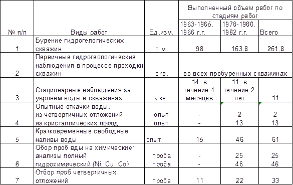 Гидрогеологические исследования на Комсомольском железорудном месторождении проводились в период предварительной (1963-65 г.г.) и детальной (1978-1980 г.г.) разведок. Виды и объемы работ приведены в нижеследующей таблице: