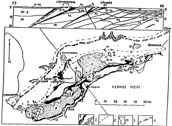 Сложность строения Горного Крыма во многом обусловлена широким распространением эндогенно-тектонических микститов – меланжей и экзогенно-тектонических (оползневых) - олистостром. Аналогичные образо-вания широко распространены в Альпийско-Гималайском и других горно-складчатых поясах мира. Районы распространения хаотических комплексов и очень разные размеры слагающих их элементов (от сантиметров-метров до десятков километров) не укладываются в рамки упорядоченных тектонических структур. Поэтому они рассматриваются отдельно. Меланжи. Сместители крупнейших надвигов представляют собой не плоскости, а весьма мощные зоны дробления пород, называемые меланжами. Они состоят из полностью пеpeтeртогo матрикса и разновеликих глыб-кластолитов, оторванных при смещении от крыльев разрыва. Чем больше амплитуда смещения и сложность строения крыльев, тем разнообразнее состав глыб. Если на геологических картах очень мелкого масштаба такие разрывы показываются линией, то на крупномасштабных зоны меланжей занимают широкие полосы и отражаются как отдельные тела. В последние годы в Крыму нами выделены 9 региональных и несколько мелких локальных меланжей (pис. 2-3). В плане они имеют вид извилистых ветвящихся полос, частично перекрытых более молодыми образованиями (рис. 4). Поскольку paнее в Крыму меланжи практически не выделялись, приведем их краткую характеристику. Присутурный меланж вскрыт скважинами вдоль Предгорной сутуры. Его глыбы, размерами до десятков-сотен метров, состоят из песчаников, известняков и различных магматических пород среднего, основного и ультраосновного составов. Матрикс состоит из динамометаморфических милонитизированных хлорит-серецит-тальковых и др. сланцев с обилием жил белого кварца, смятых в хаотические лежачие складки. Он полого наклонен на ССЗ и подстилается мощной дислоцированной толщей юрских конгломератов и песчаников Битакского краевого прогиба.