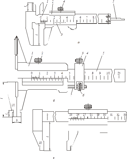 Штангенциркуль ШЦ – I с двусторонним расположением губок (рис.1, а) для наружных и внутренних измерений и с линейкой для измерения глубин (цена деления нониуса 0,1 мм, предел измерений от 0 до 125 мм) имеет штангу (линейку) 1 с основной шкалой, деления которой нанесены через 1 миллиметр. Штанга имеет неподвижные измерительные двусторонние губки с рабочими поверхностями, перпендикулярными штанге. По линейке перемещается измерительная рамка 2 со второй парой губок; на рамке имеется стопорный винт 4 для ее фиксации в требуемом положении. На измерительной рамке нанесена дополнительная шкала – нониус 3. Наружные размеры измеряют нижними губками, имеющими плоские рабочие поверхности малой ширины. Верхние губки применяют для измерения внутренних размеров. Линейка – глубиномер 5 предназначена для измерения высоты уступов, глубины глухих отверстий и т.п. Штангенциркуль ШЦ – II с двусторонним расположением губок (рис.1, б) предназначен для наружных и внутренних измерений и разметочных работ. Состоит из тех же основных деталей, что и ШЦ – I, но имеет вспомогательную рамку микроподачи 4 для точного перемещения рамки 1 по штанге 5. Для этого необходимо предварительно зафиксировать вспомогательную рамку 4 стопорным винтом 3, а затем, вращая гайку 6 по микровинту 7, перемещать измерительную рамку по штанге. Как правило, этой подачей пользуются для точной установки размера на штангенциркуле при разметке. Остроконечные губки штангенциркуля ШЦ – II применяют для разметки или измерения наружных размеров в труднодоступных местах. Нижние губки для измерения внутренних размеров имеют цилиндрические рабочие поверхности. Размер губок в сведенном состоянии обычно бывает равен 10 мм и определяет наименьший внутренний размер, который может быть измерен этим штангенциркулем. При внутренних измерениях к отсчету по шкале следует прибавить размер губок, указанный на их боковой стороне. Штангенциркули типа ШЦ – II имеют нониусы с ценой деления 0,1 и 0,05 мм и пределы измерения 0 – 160, 0 – 200, 0 – 250 мм. Штангенциркуль ШЦ – III не имеет верхних остроконечных губок и устройства для микроподачи измерительной рамки. Он применяется для наружных и внутренних измерений с помощью таких же, как у ШЦ – II, нижних губок. Цена деления нониуса 0,1 и 0,05 мм, пределы измерений от 0 до 2000 мм. Штангенглубиномер (рис.2) служит для измерения глубин и выступов. Он состоит из основания 1, штанги 6 с основной миллиметровой шкалой, измерительной рамки 3, стопорного винта 2, устройства микрометрической подачи 5, стопорного винта 4, гайки и винта 7 микрометрической подачи и нониуса 8.