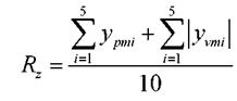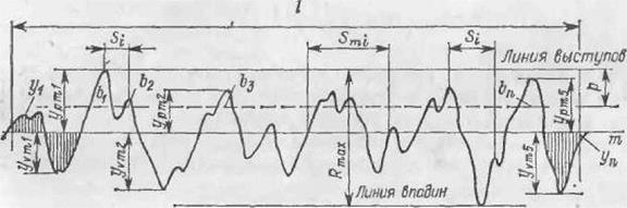 Высота выступа профиля ypm — это расстояние от средней линии профиля до высшей точки выступа профиля. Глубина впадины профиля yvm —это расстояние от средней линии профиля до низшей точки впадины профиля. Неровность профиля — это выступ профиля и сопряженная с ним впадина профиля. Шаг неровностей профиля —это длина отрезка средней линии профиля, содержащая выступ профиля и сопряженную с ним впадину профиля (рис. 1). Средний шаг неровностей профиля Sm — это среднее значение шага неровностей профиля по средней линии в пределах.базовой длины. Шагом местных выступов называется длина отрезка средней линии между проекциями на нее двух наивысших точек соседних местных выступов профиля. Средним шагом S местных выступов профиля называется среднее значение шага местных выступов в пределах базовой длины. Для оценки шероховатости поверхности в машиностроении получил большое распространение высотный критерий Rz. Высота неровностей профиля по десяти точкам Rz представляет собой сумму средних абсолютных значений высот пяти наибольших выступов профиля и глубин пяти наибольших впадин профиля в пределах базовой длины I, т. е.