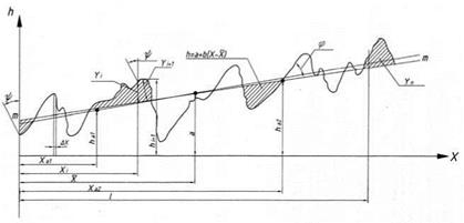 где Ув - вертикальное увеличение записи микрорельефа. • Проведение средней линии Для измерения параметров шероховатости при ручной обработке профилограмм допускается приближенное определение направления средней линии. При этом погрешность угла наклона средней линии не превышает 2° при длине профилограммы 250... 300 мм. Для номинально прямолинейного профиля на профилограмме на участке, определяемом базовой длиной, допускается визуальное проведение средней линии параллельно общему направлению профиля так, чтобы площади по обеим сторонам от этой линии до профилограммы были примерно равны между собой. Приближенное положение средней линии можно найти по методу средних. Для этого определяют координаты двух точек (хаЬ ha1) и (ха2, ha2) (см. рис. 5) по формулам:
